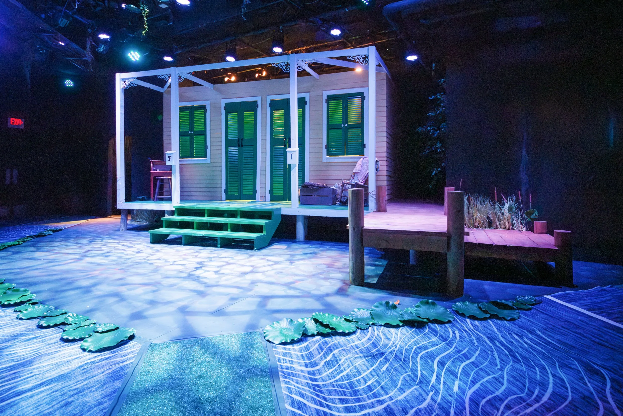 In this New Orleans storybook world, my scenic design was inspired by the vibrant Creole Cottage architecture of the people of New Orleans. Surrounded by a bayou water carpet for our young audiences to sit on.